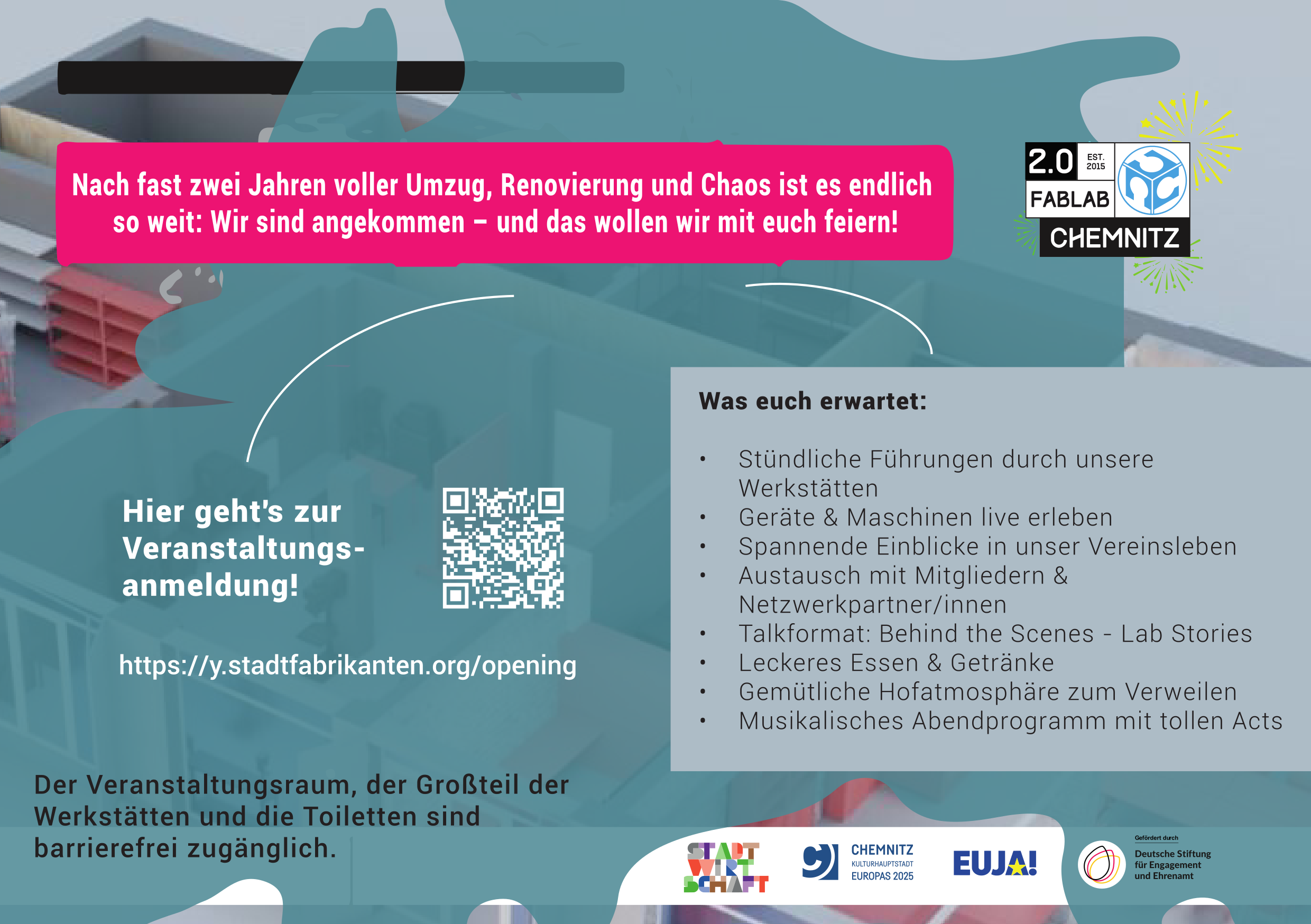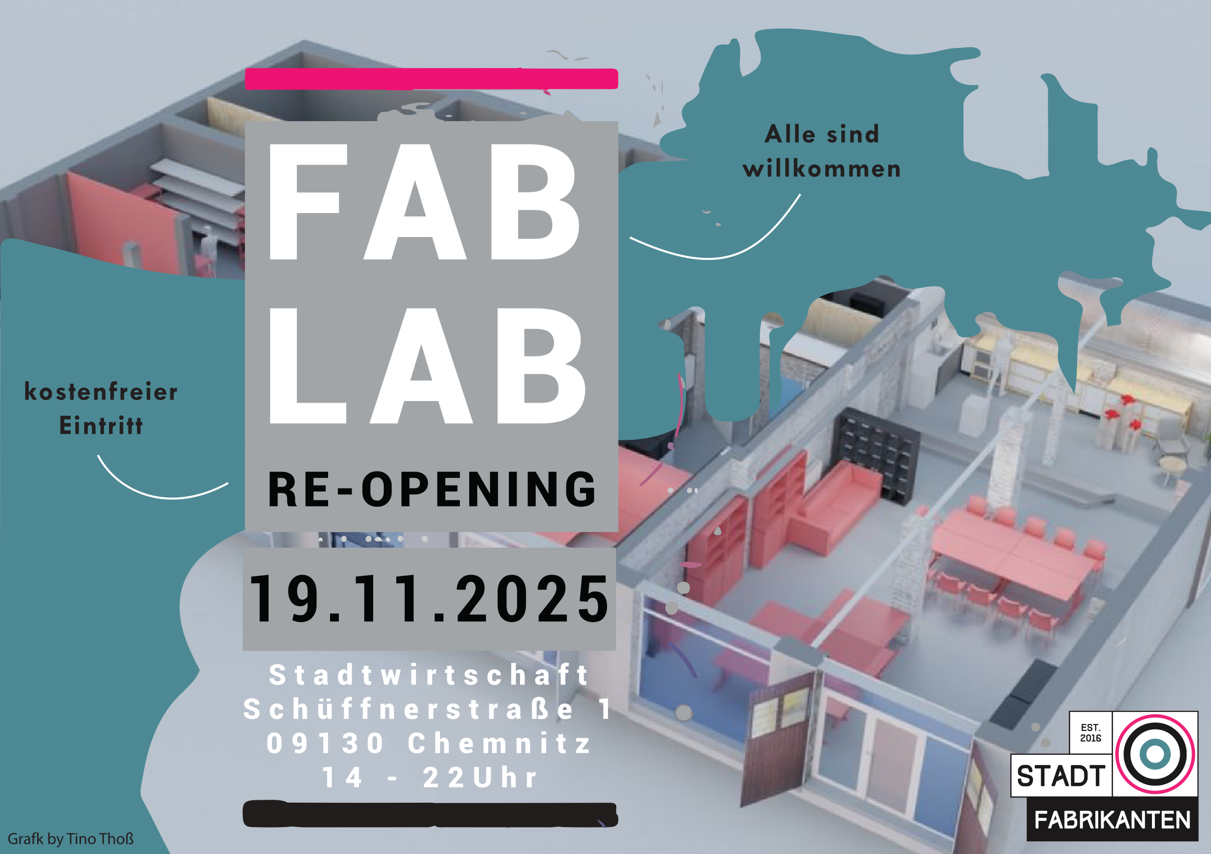 Wir, der Stadtfabrikanten e.V., laden hiermit zur feierlichen Wiedereröffnung unseres FabLab Chemnitz 2.0 in der Stadtwirtschaft ein.