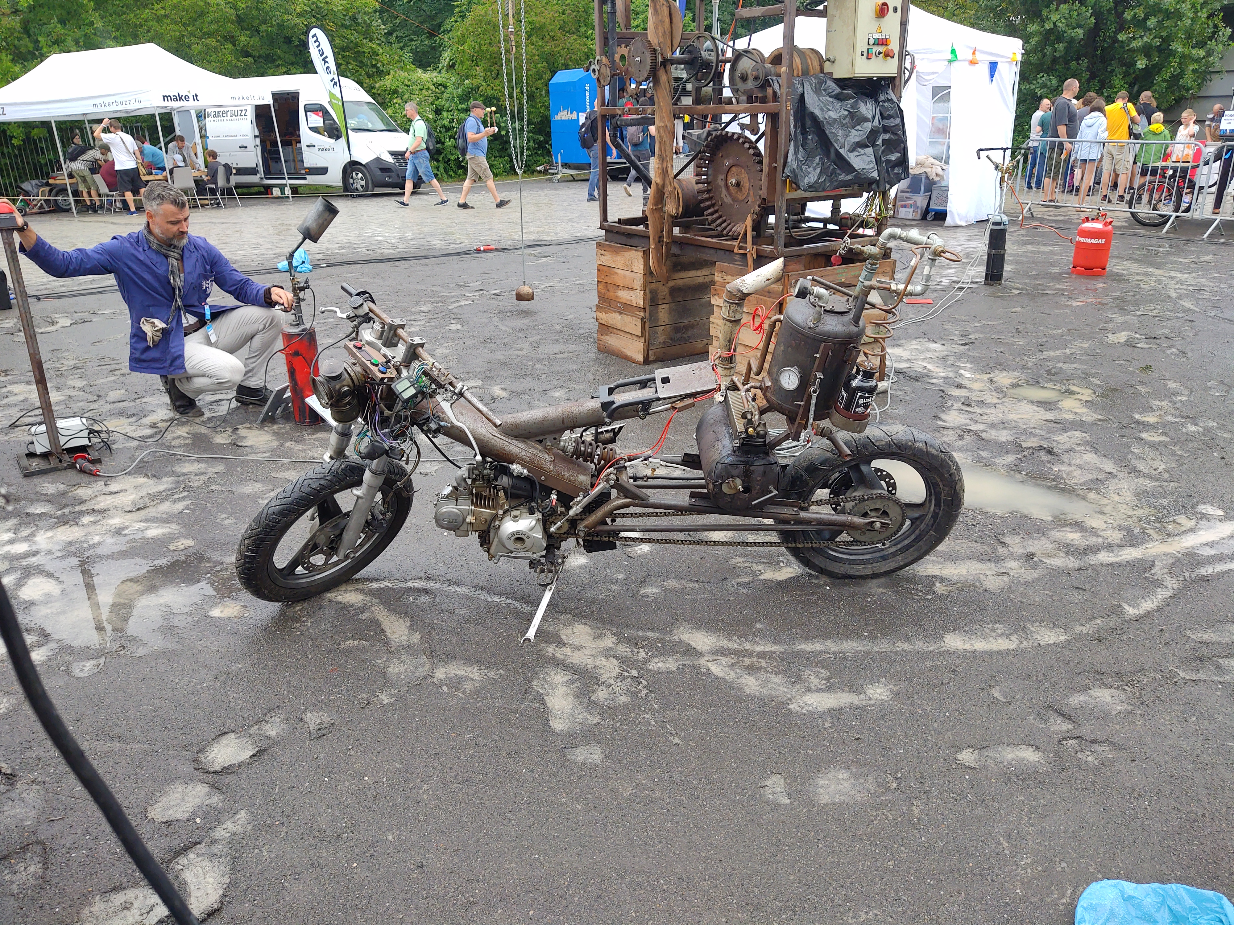 As MF Hannover was celebrating its 10th anniversary, we brought along an extra and at the same time made an effort to present our network of friends. This resulted in a chill-out geodome corner with handmade deckchairs from the KOSMOS Festival 2024 (thanks to the Holzkombinat and the BuntmacherInnen!) and the metal animals from our member Björn Grunewald. Unfortunately, the weather was not so friendly. A few hard-boiled people braved the wet anyway and treated themselves to a break in the open air - together with chips and blinky lights ;-)